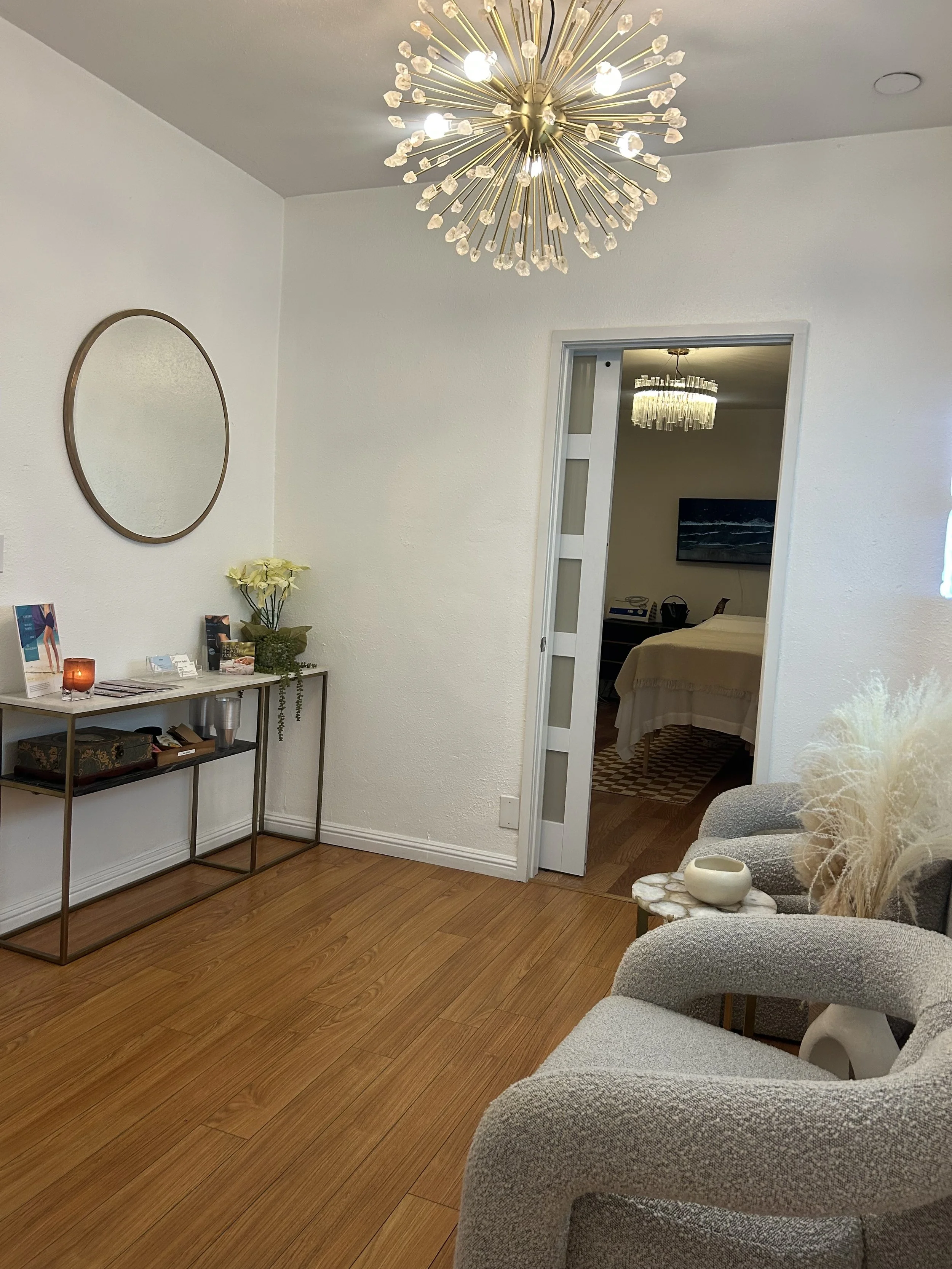 Our Beverly Hills location is set within a quiet wellness suite alongside other self-care businesses, offering private Pilates-based personal training and assisted stretching, by appointment only. This space was designed for women seeking a calm, elevated alternative to traditional gyms.